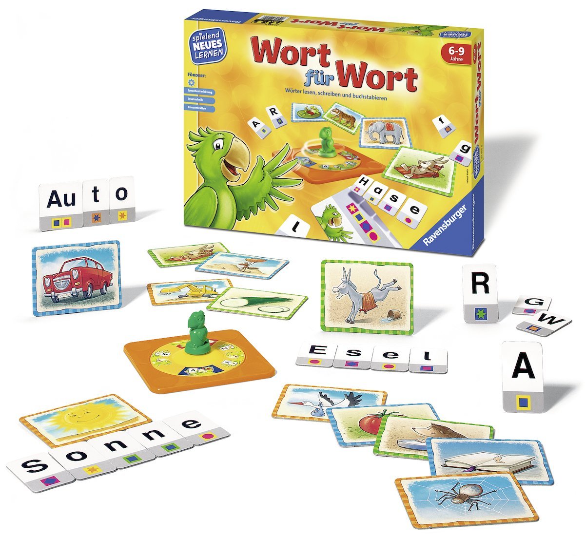 Wie viele Buchstaben man nehmen darf, zeigt der freche Papagei auf der Drehscheibe. Ob das Wort richtig geschrieben ist, kann man auf der Bildrückseite selbst kontrollieren.