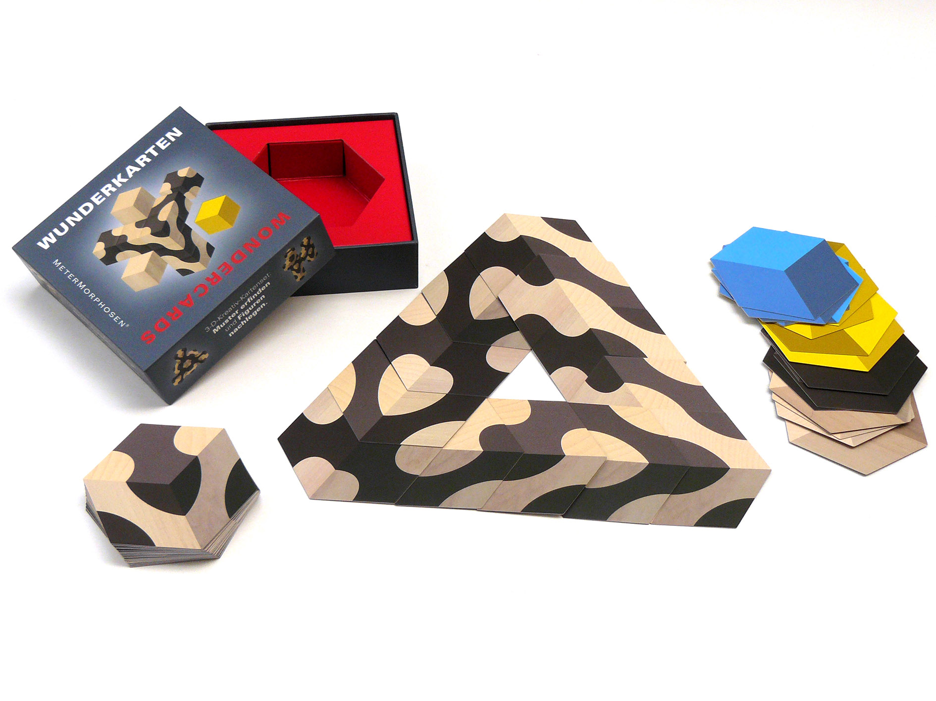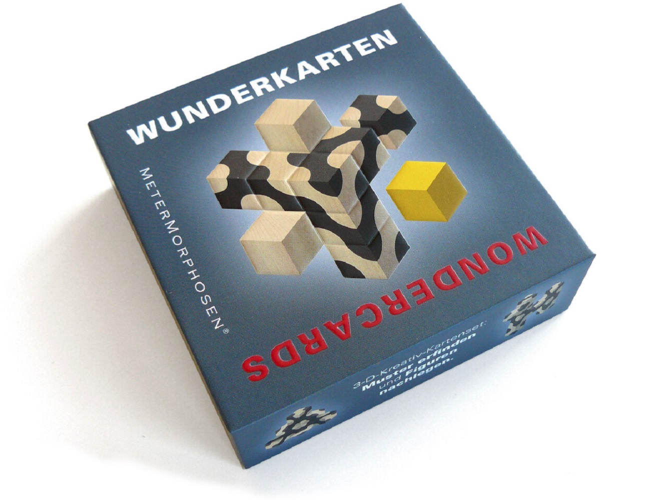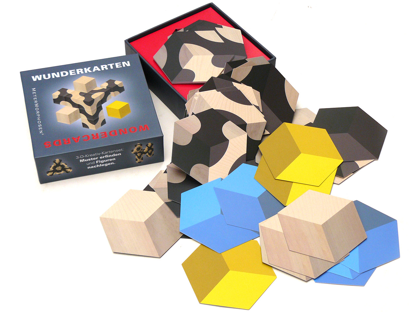 MeterMorphosen bringt in diesen Tagen Wunderkarten heraus, die ein völlig neues Genre darstellen, denn das Spiel bewegt sich irgendwo zwischen Puzzle, Domino, Patience und dem Spieleklassiker Tangram, bei dem man Figuren nachlegen muss. Mit diesen Würfelkarten in 3-D-Optik entstehen unzählige, überraschende, originelle, mögliche und unmögliche dreidimensionale Gebilde und Figuren, die zu immer neuen Formfindungen einladen.